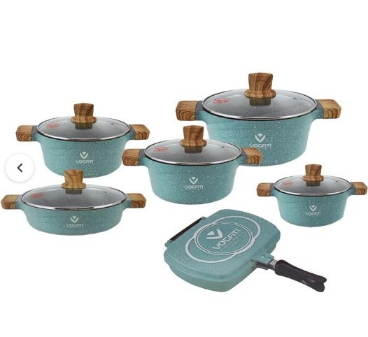 ۴ سایز قابلمه و یک سایز ماهیتابه و همچنین یک عدد ماهیتابه بدون روغن تاشو