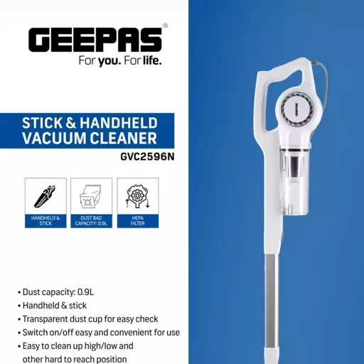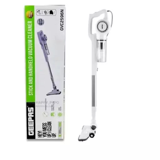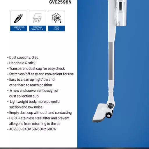 جاروبرقی بدون کیسه جی پاس مدل GVC2596، با فیلتر HEPA، وزن 2.4 کیلوگرم، دارای دو عدد سری مجزا، کنترل روی دسته، موتور با توان مکش 600 وات، میزان صدا 75 دسیبل، طول کابل برق 4.5 متر، گنجایش مخزن 0.8 لیتر، قابلیت افزودن سری های همراه